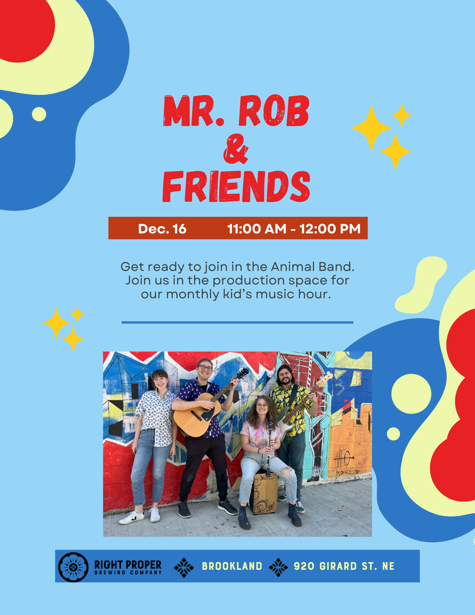 Mr. Rob is an educator, musician, and performer in Washington, DC, who teaches early childhood music for DC Public Schools, plays in the drum line for the Washington Commanders, and performs with his band, Mr. Rob and Friends. Mr. Rob and Friends is a band dedicated to bringing high-quality, engaging music to early audiences that centers on child development and learning. Their performances include original songs, covers of classics, dancing, audience participation, and lots of fun!